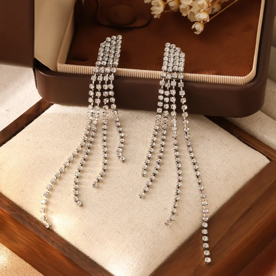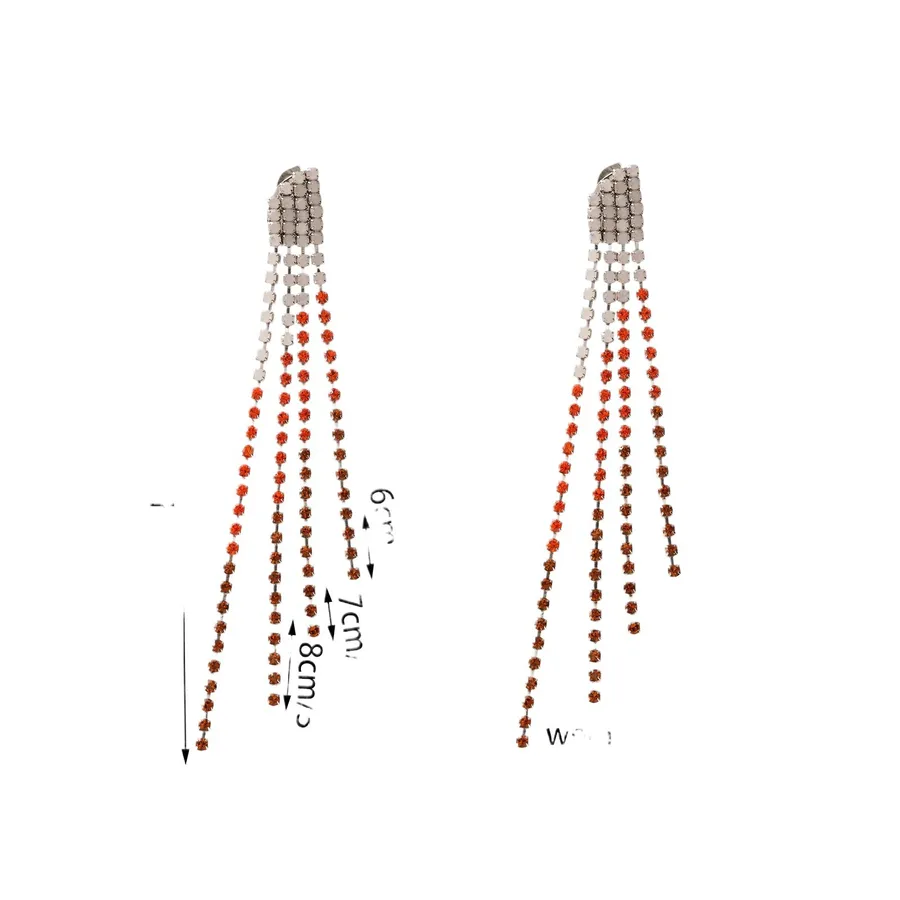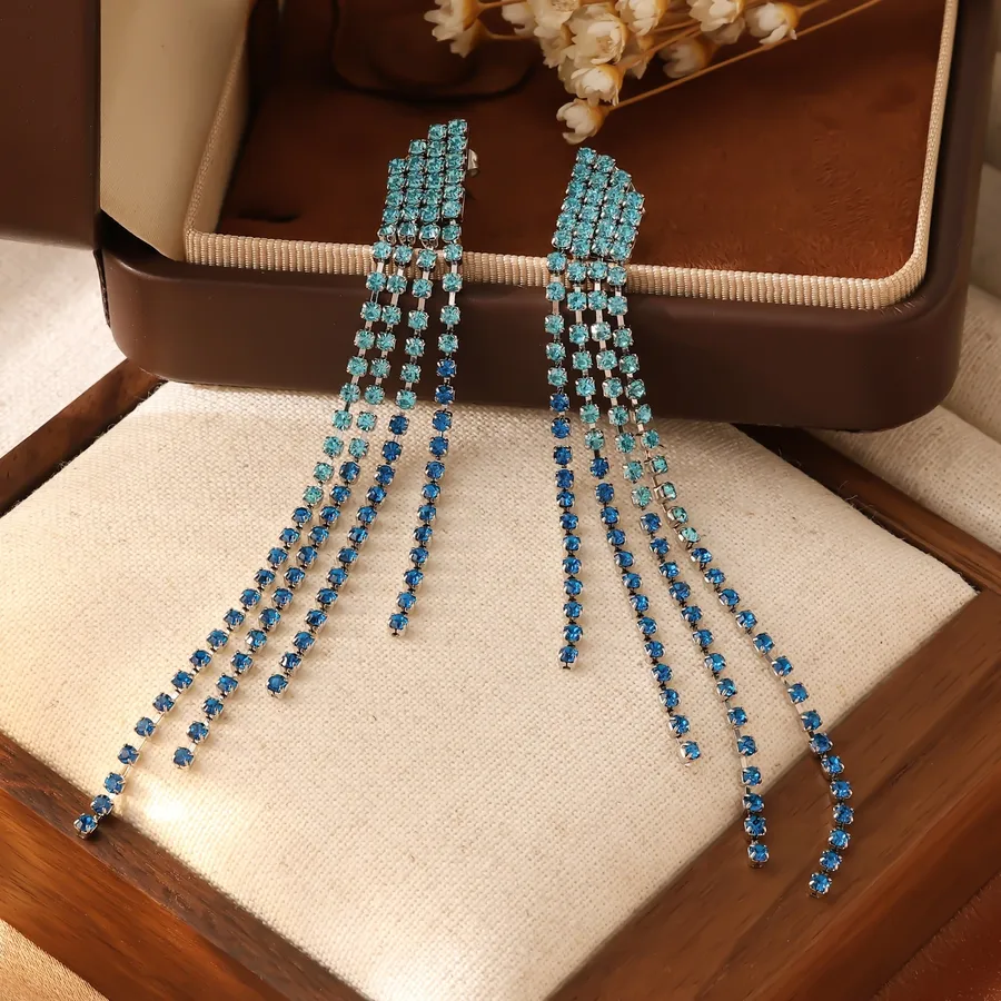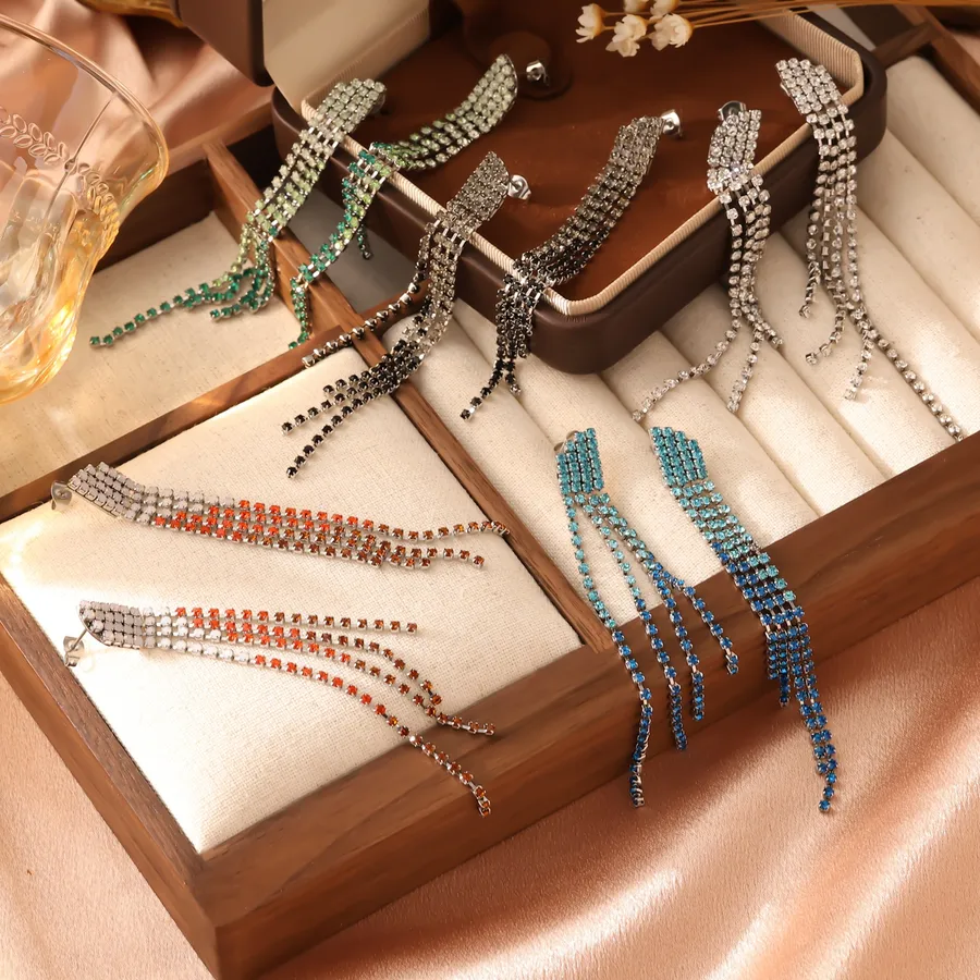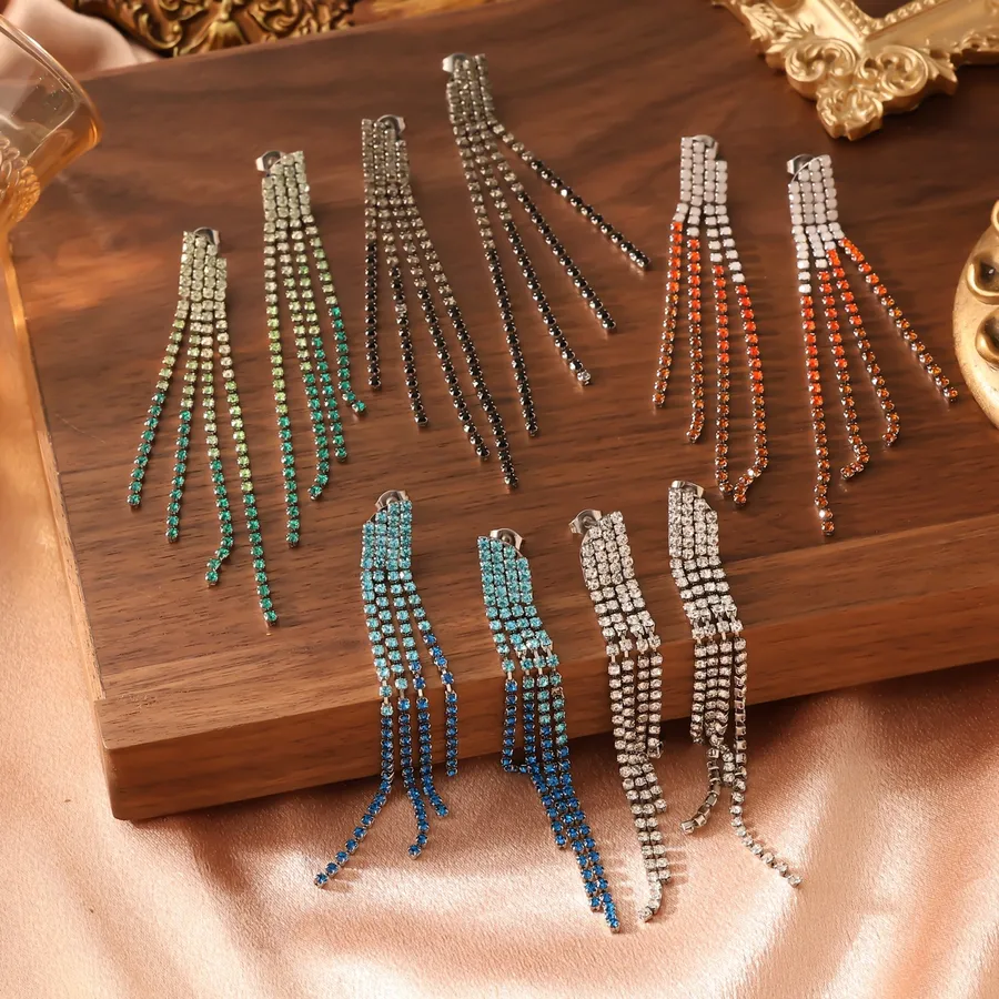 Gradient Green Zircon Tennis Chain Earrings for Women Three Row Tassel Diamond Pendant Earrings Jewelry Accessories